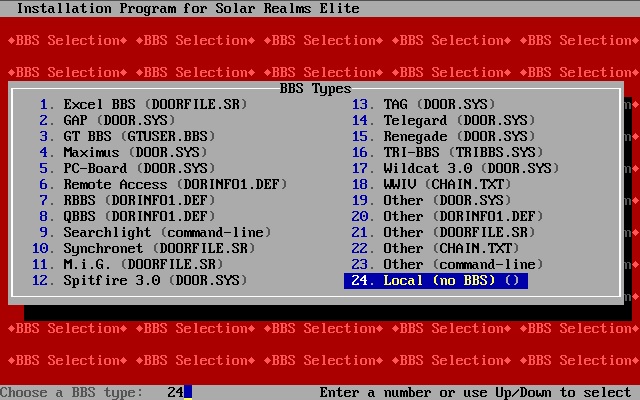 Solar Realms Elite (SRE) was written in 1990–1994 for BBS systems running on IBM PCs.