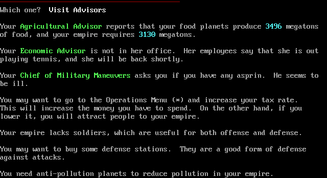 Many times, you may wish to send messages to other empires in the game. From the Game menu or the Operations menu, you can send messages (item [7] on the menu). Messages can be either private (email) or public (posts).