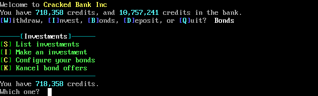 If your sysop is running the REGISTERED version, and the bank is enabled, you will enter the bank. You can deposit credits as a savings account, on which you will earn interest, or get a loan, which you will have to make yearly payments. Each year, interest is accumulated on a savings account or on a loan. Early payback of a loan reduces some of the interest costs. You can also invest in Galactic Coordinator Bonds. They cost 8500 credits and they return 10,000 credits after some amount of time.
