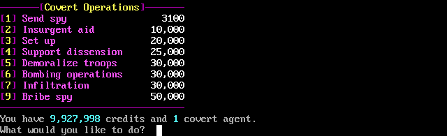 You can get information about another empire, similar but less detailed than your own status screen. Spying may not always be successful, but you can guarantee that you can get a spy report by bribing a spy in the other empire (see option 9). You can spy as many times as you like. -