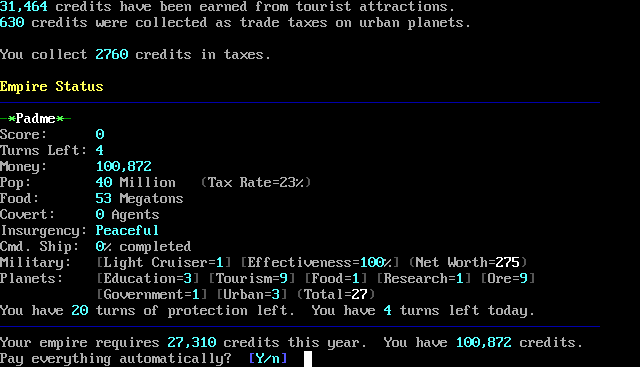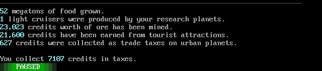 You will be prompted to pay your forces, your planets, the bank (to repay a loan), and taxes to the Galactic Coordinator. In the registered version, you can visit the bank before you do this to get extra funds if necessary. If the system determines that you can afford to pay everything fully, it will ask you whether you want to pay it all at once, and if you do, it will not ask you to pay for each item individually.