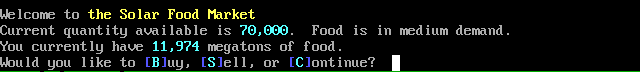 In the Food Market, which is owned and operated by the Galactic Coordinator, you can buy or sell food. Your people and army require food each turn; if you have extra food, you can sell it to the market. If you do not have enough, you can buy food. The default amount to buy is the amount that you need to feed everyone this year; if you can feed them all, the default is to buy 0.
