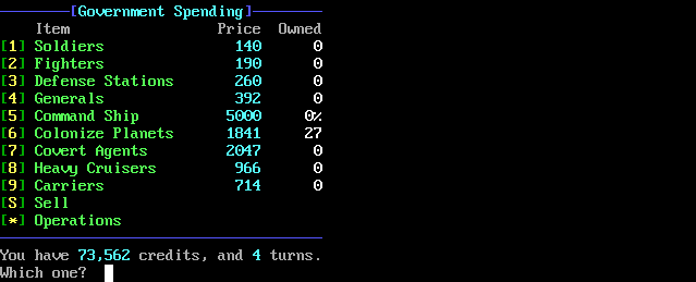 The operations menu can be accessed by pressing [*]. The system menu allows you to go back to the bank or covert operations menu. It also lets you see your status screen or the scores. You can buy a Super Lottery Ticket in this menu. One Super Lottery Ticket is selected at the end of the day to be the winner. All players will be notified of the winner of the jackpot. From the system menu, you can configure the game to your suiting (like choosing short/long descriptions, report dates, etc.), see the intructions (this file!), check waiting trade deals, abdicate (who’d want to do that?), and set the taxation rate (the percentage your police steal from each person’s pocketbook every year), and set a draft rate (to draft people into your military for defense against an attack).