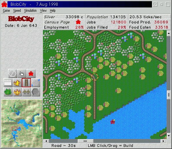 At present, the game is playable, although it’s not complete. (The main problem is lack of documentation and the inability to save and load games, IMO.) The play in BlobCity is “Blobs vs. Nature” (single player) instead of “Blobs vs. Blobs” (human player vs. computer players), which had been planned for the second SimBlob game. Like SimCity, there is no predetermined goal; instead you set your own goals. You are building a town and seek to conquer the elements. Try to build your towns to withstand floods, yet be near sources of water. Try to build your towns to withstand fires, yet be near forests. Try to achieve 600,000 population without auto-build mode. (My highest population in the old economic system is 653,712; my highest in the new economic system is 1.13million.) Try to have more food than people in your town.
